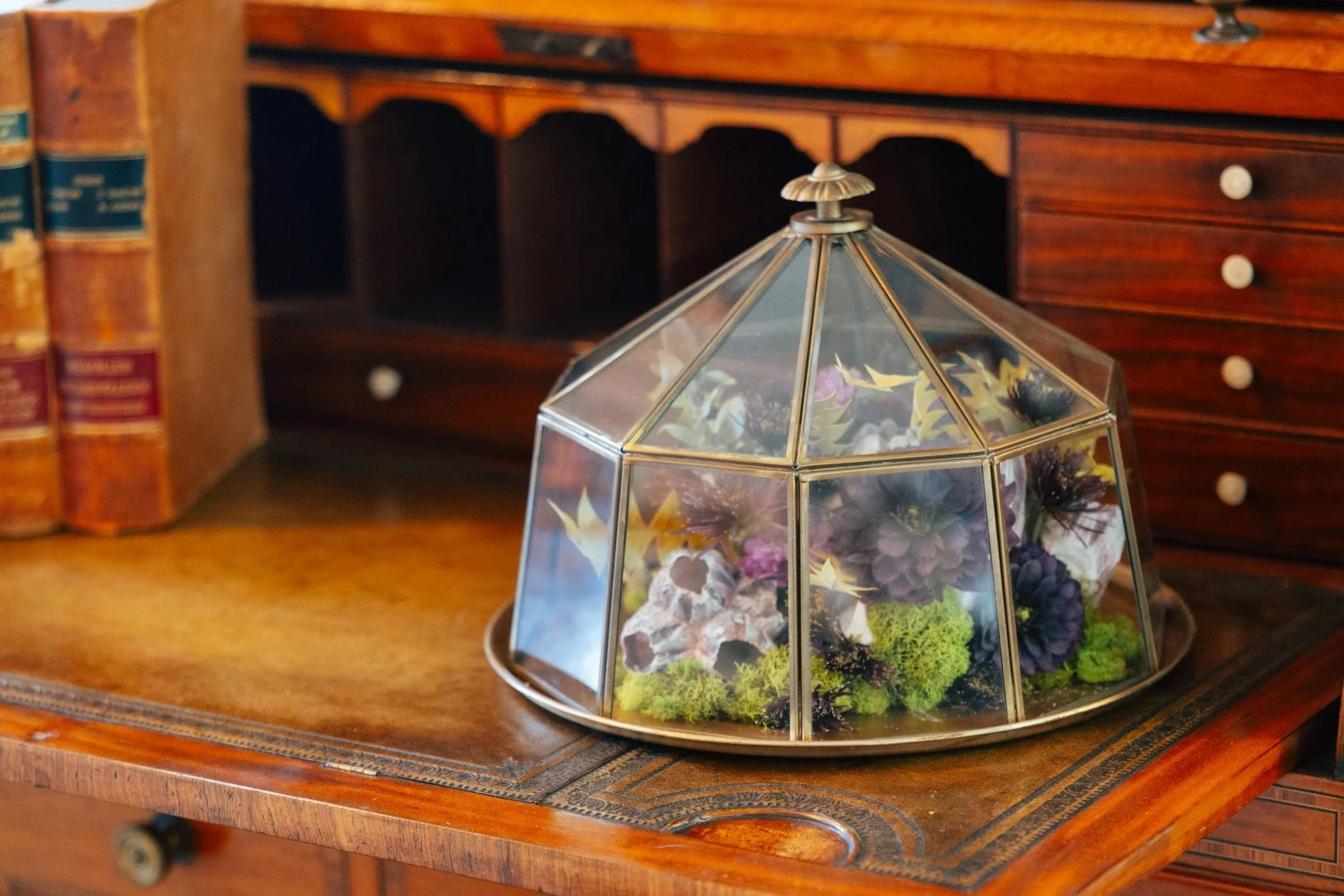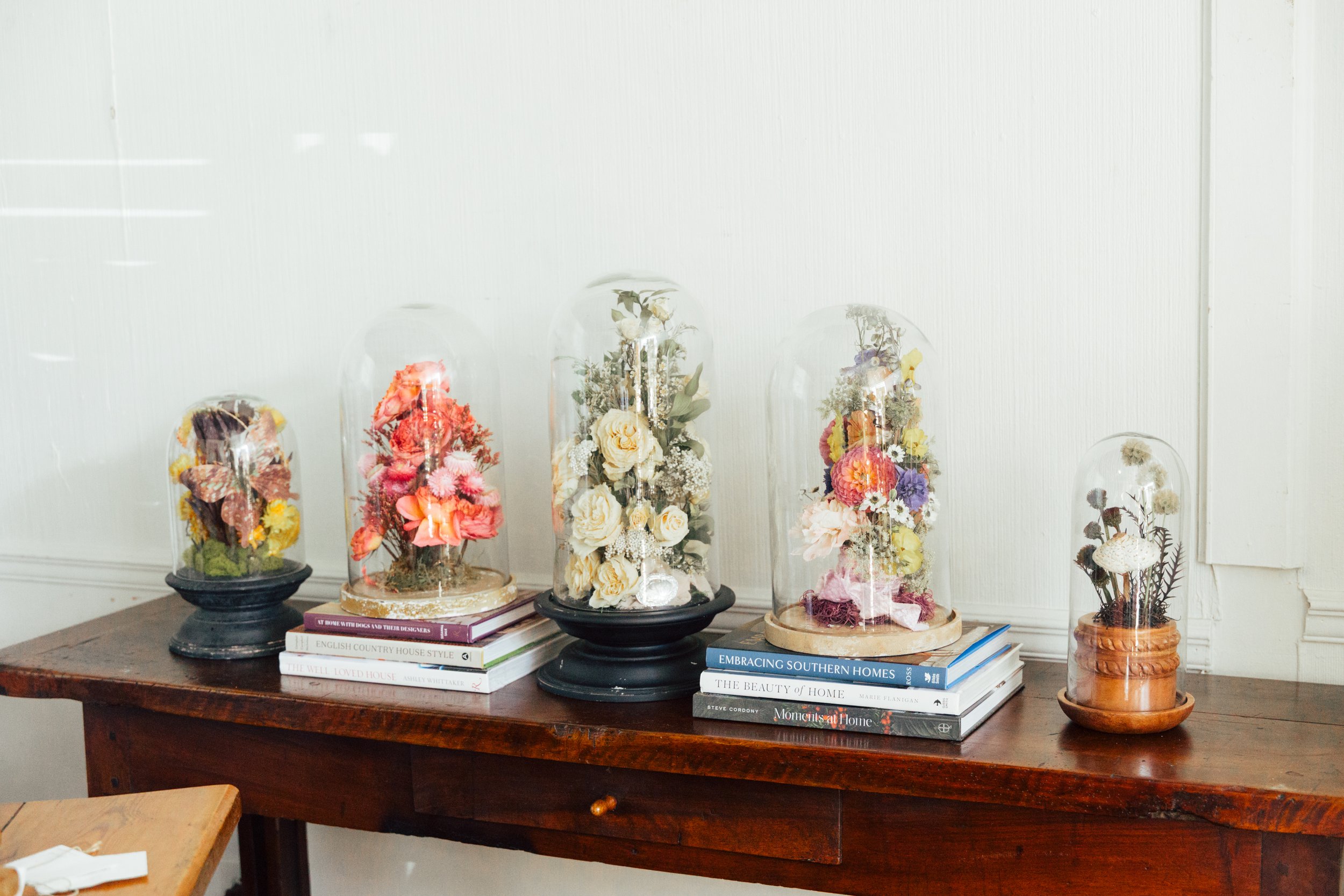 I love creating custom cloches. As a floral designer, I often preserve flowers from events that I create fresh arrangements for, so I have a great collection of preserved flowers to choose from. Tell me what you’ve got in mind, and we’ll make it happen.